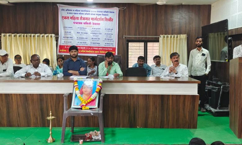 एकल महिलांना विविध उद्योग व्यवसायाच्या माध्यमातून रोजगार निर्मितीसाठी पंचायत समिती सभागृहात रोजगार मार्गदर्शन शिबिर आयोजित करण्यात आले होते. शिबिराच्या अध्यक्षस्थानी तहसीलदार संजय बिरादार होते. याप्रसंगी नेवासा तालुक्यातील बचत गटाच्या 250 हून अधिक एकल महिला रोजगार मार्गदर्शन शिबिरात सहभागी झाल्या होत्या .